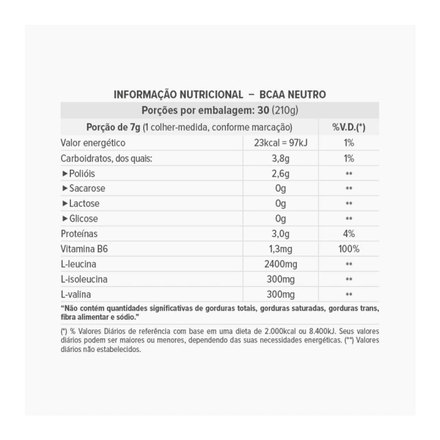 Suplemento que combina os aminoácidos essenciais BCAA com a vitamina B6 em sua forma ativa. Sua formulação foi desenvolvida respeitando a proporção de 8:1:1, ou seja, 8 partes de L-leucina a cada 1 parte de L-isoleucina e L-valina. A L-Leucina é o aminoácido mais importante na musculatura e a vitamina B6 participa de diversas funções enzimáticas.