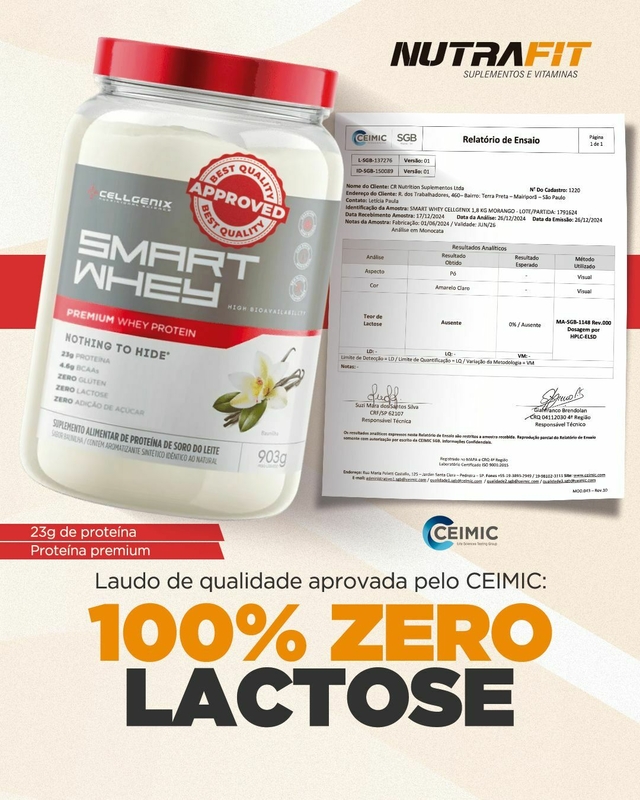 Descubra o poder da Smart Whey, a proteína ZERO LACTOSE da Cellgenix! Com 23g de proteína por porção e 81% de concentração, ela é ideal para quem busca qualidade e performance.